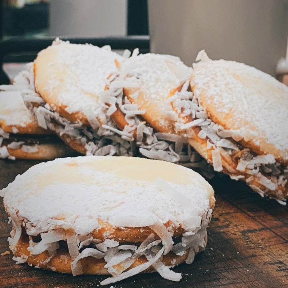 - Alfajor - In-house made sandwich cookie filled with dulce de leche and topped with coconut shavings