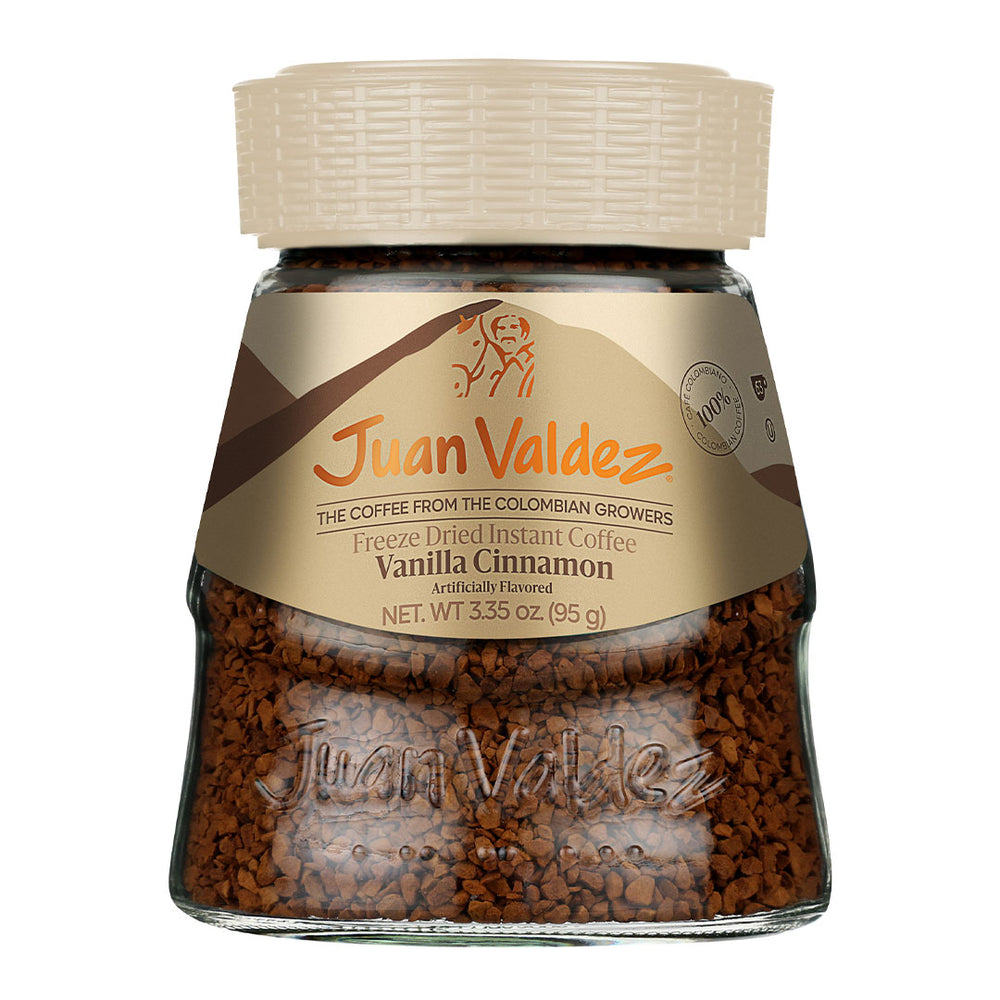 - Juan Valdez Vanicanela - Juan Valdez freeze-dried Vanilla & Cinnamon coffee is a full flavour, freeze-dried soluble coffee that will give you all the flavours of a traditional hot cup of Colombian coffee with added vanilla & cinnamon flavour! It will dissolve instantly in hot water giving you a delicious, smooth and rich taste.