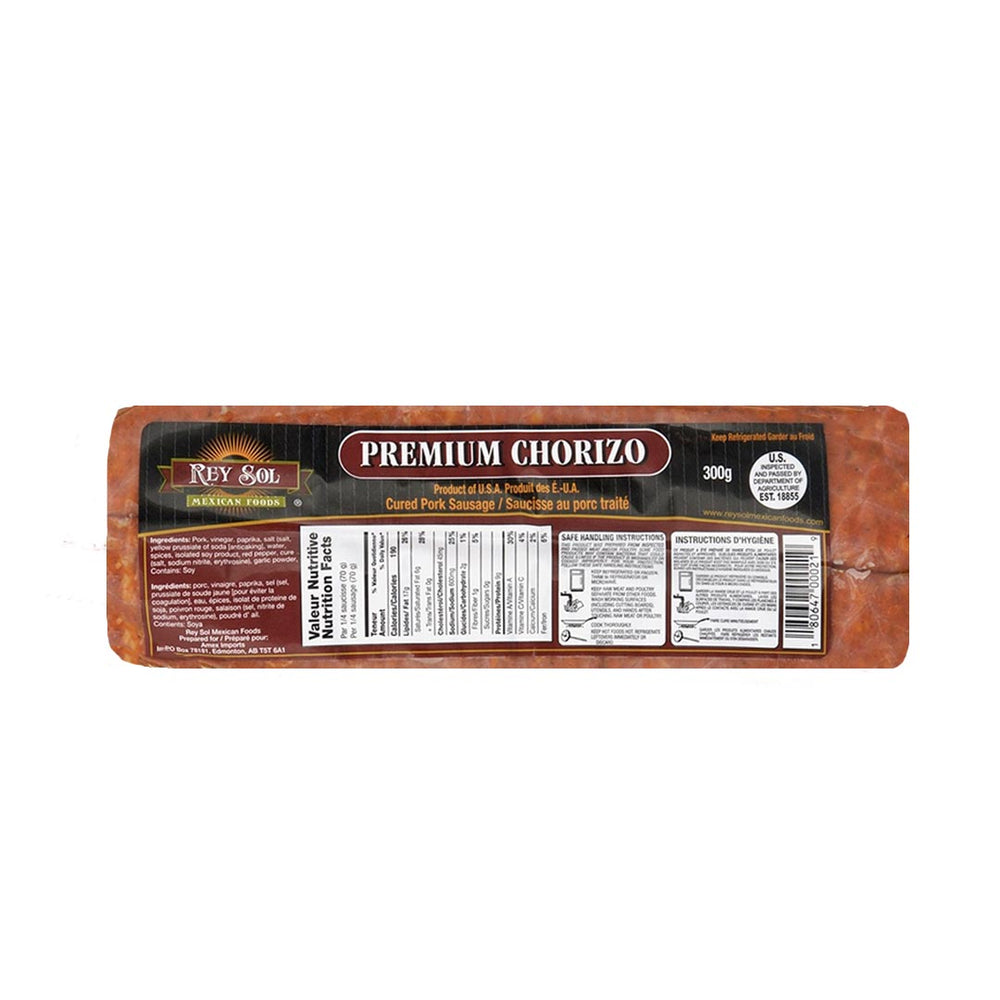 - Rey Sol Premium Chorizo - Authentic Mexican chorizo, the tasty minced spicy pork sausage, made with ham trimmings. Its consistency makes blending with other ingredients easy.