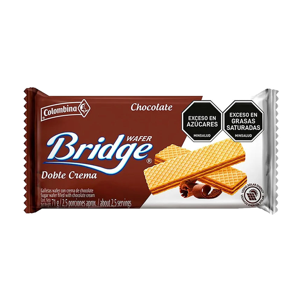 - Bridge Chocolate - Experience the rich, delightful taste of Bridge Chocolate Wafer Cookies! These premium chocolate wafer cookies feature layers of crisp wafers enveloped in smooth, decadent chocolate. Perfect for satisfying your sweet cravings or enjoying with a cup of coffee or tea, Colombina chocolate wafer cookies offer a deliciously crunchy and indulgent treat.