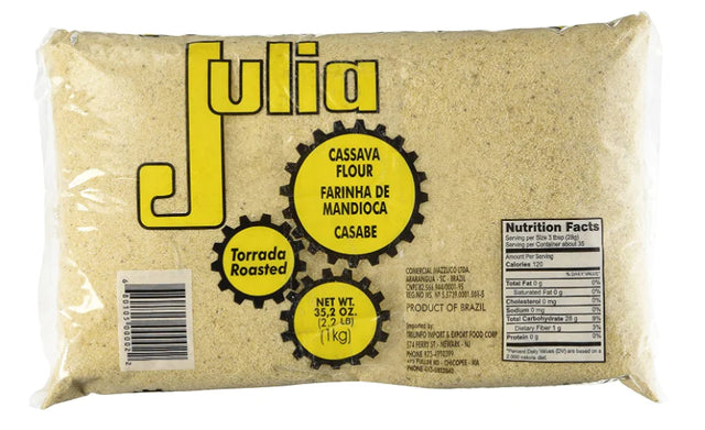 - Julia Cassava Flour Roasted (Farinha de Mandioca): Roasted Cassava Flour, also known as Farofa de Mandioca, is a traditional Brazilian ingredient used in many dishes, especially during barbecues and feasts. Made from cassava, this flour is toasted to bring out a nutty flavor and crispy texture. It can be used as a topping for rice and beans, stews, and salads, or as a side dish for meat dishes. The Julia brand offers a high-quality roasted cassava flour.