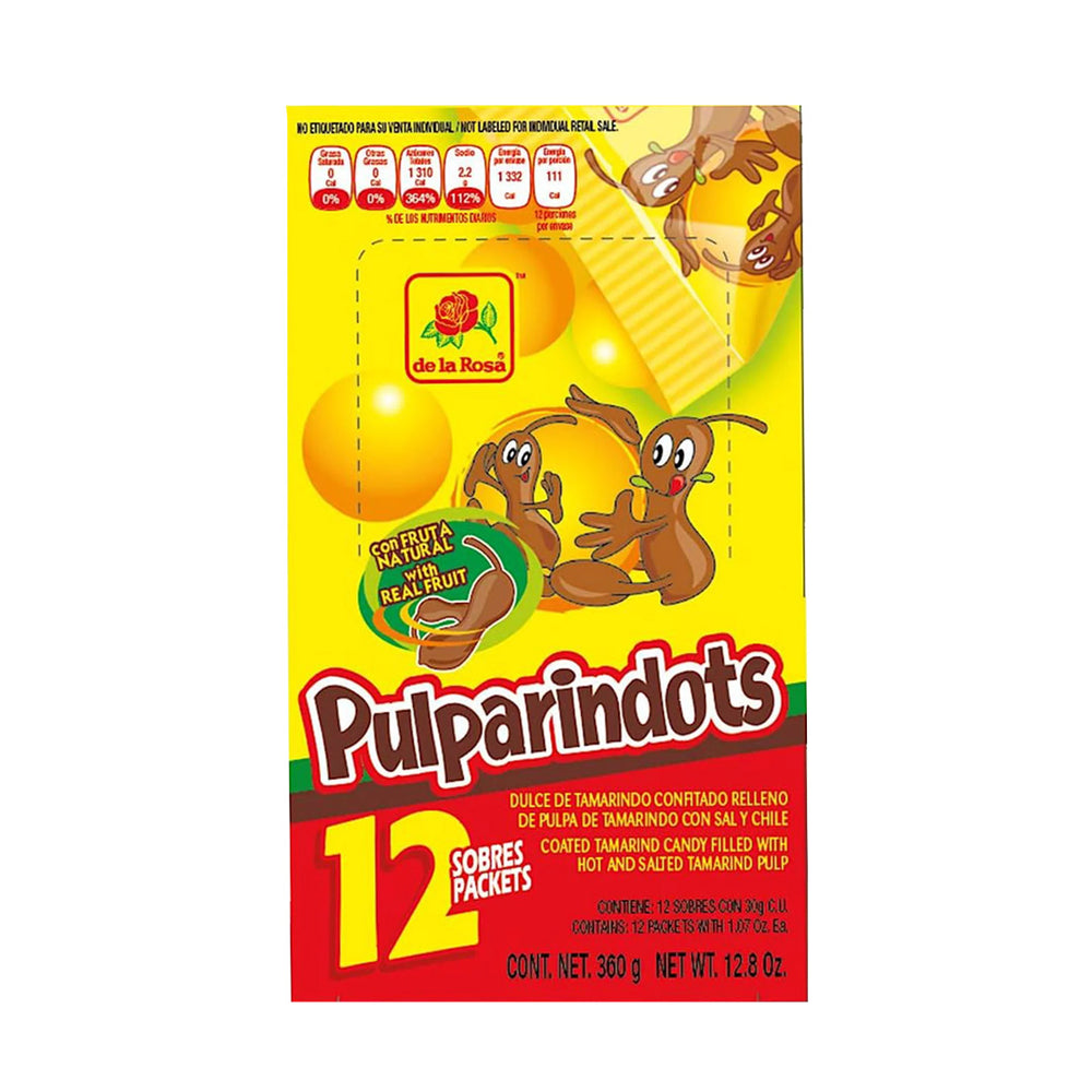 - Pulparindo - Savor the bold and tangy flavor of De La Rosa Pulparindots Original—bite-sized Mexican tamarind candies with a spicy chili twist. Each of the 12 packets contains chewy tamarind pulp coated in a sweet and spicy shell, delivering an authentic taste of Mexico. Perfect for snacking or sharing, these Pulparindots offer a delightful combination of sweet, sour, and spicy flavors in every bite