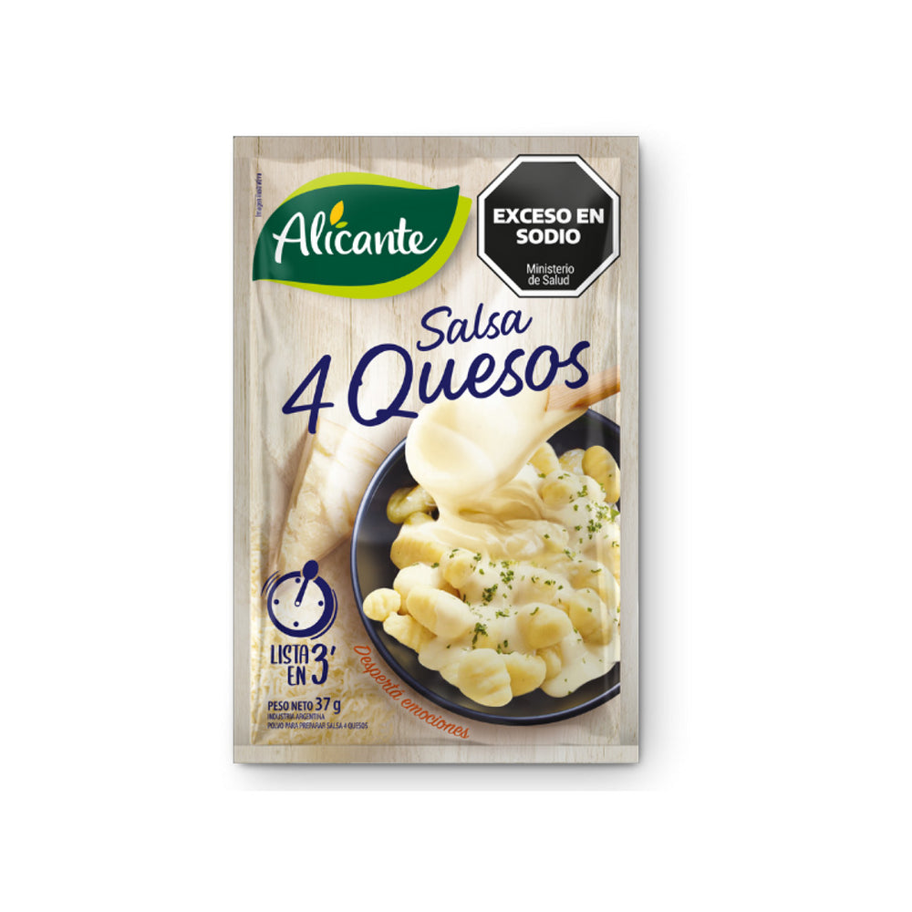 - Salsa 4 Quesos - Indulge in rich, cheesy goodness with Alicante Salsa 4 Quesos – 37 g, a quick and easy mix to prepare a creamy four-cheese sauce in minutes. Made with a delicious blend of cheeses, this versatile sauce pairs perfectly with pasta, vegetables, meats, or as a dipping sauce. Conveniently packaged for single-batch preparation, Alicante 4 Quesos brings gourmet flavour to your table with minimal effort.